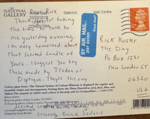 Oh: and if it seems I’m making more out of the “candle aspect” of the interview than really happened, take a look below at the hilarious postcard Sedaris sent me a few days later.