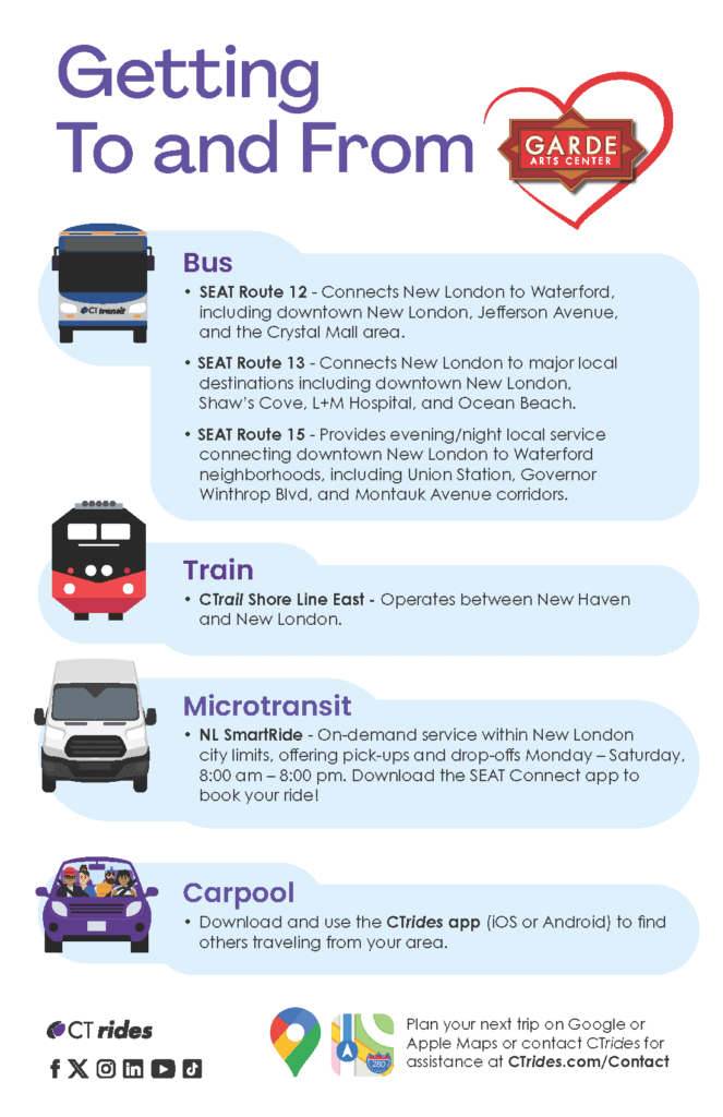 Hop aboard Shore Line East and enjoy a relaxing ride along Connecticut’s scenic shoreline – before catching a meal downtown or before catching a show or film screening at The Garde.