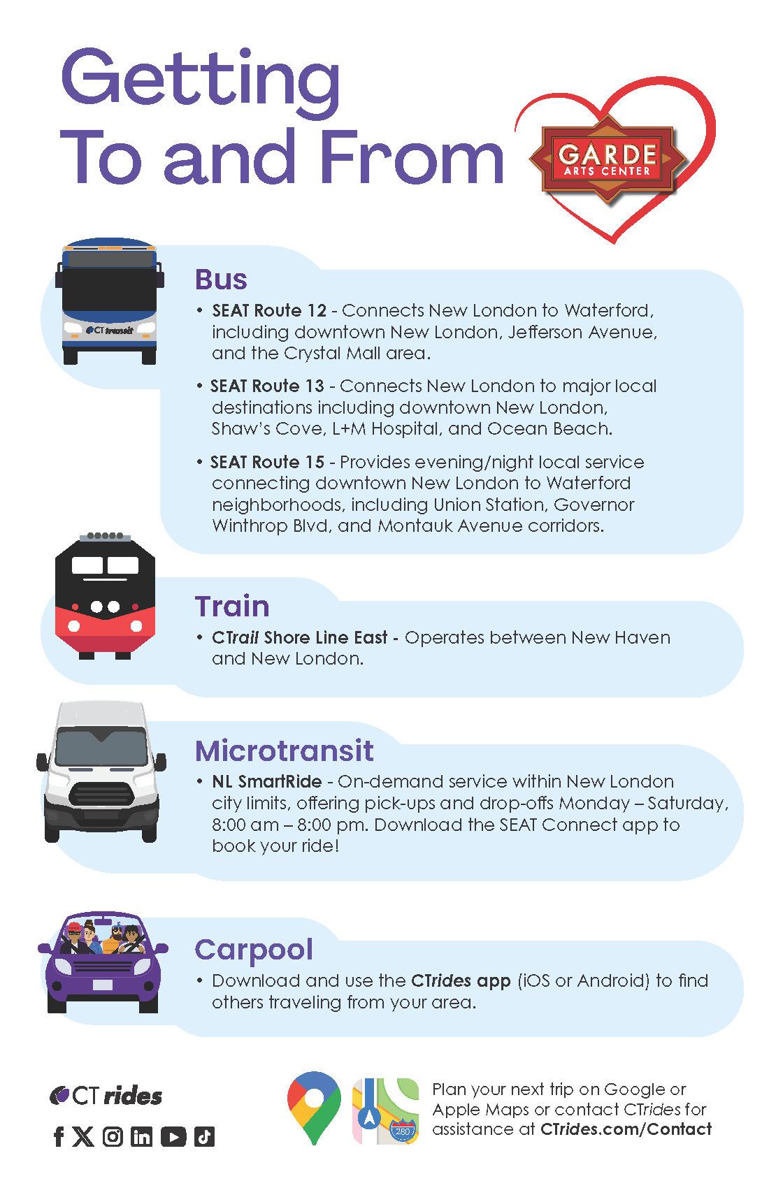 The City of New London launched its new NL SmartRide program – an on-demand public transportation service similar to ride-hailing systems like Uber. The program is open to all users and serves the City of New London with a demand response service, Monday – Saturday, between 8:00 AM and Midnight. Download the SEAT Connect app to schedule your ride! Please select locations within the city limits of New London; trips that start or end outside of New London will not be accepted. Use the traditional fixed route bus service for these trips. We only accept cash, 1-Ride Passes and all Token Transit mobile tickets.